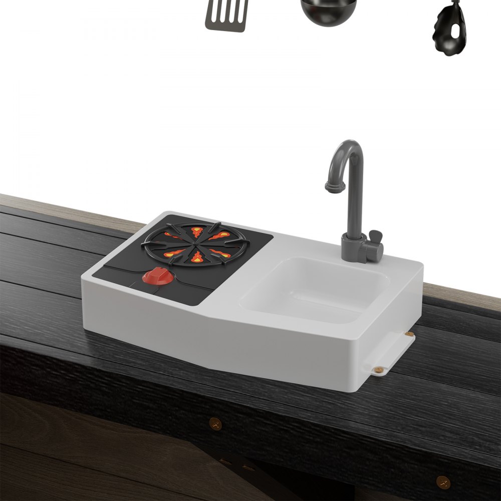W pełni wyposażona kuchnia: Wnętrze kuchni jest wyposażone w zlew z kranem, dwa zestawy naczyń kuchennych i szpatułki, co przypomina prawdziwą kuchnię. W tym domku do zabawy dzieci mogą wcielić się w małych kucharzy i doświadczyć radości gotowania.