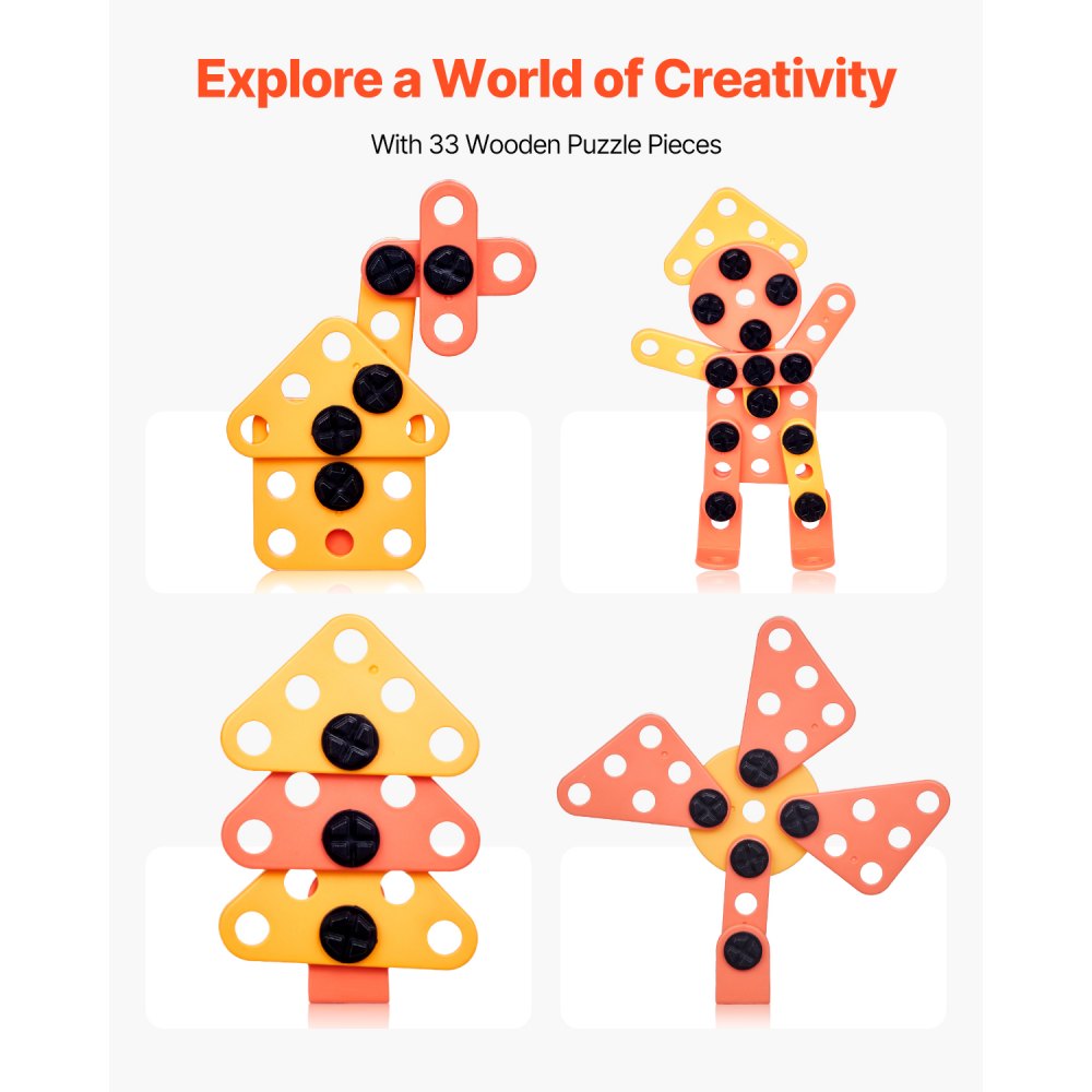 Twórz różne konstrukcje: pozwól swojemu dziecku rozwinąć wyobraźnię! Dzięki klockom puzzlowym o różnych kształtach można tworzyć nieskończoną liczbę projektów. Ta zabawka warsztatowa rozwija zdolności motoryczne i zdolność rozwiązywania problemów, jednocześnie zachęcając do samodzielnej zabawy. Idealne dla małych rączek i wielkich pomysłów, niezbędne do pobudzenia dziecięcej kreatywności!