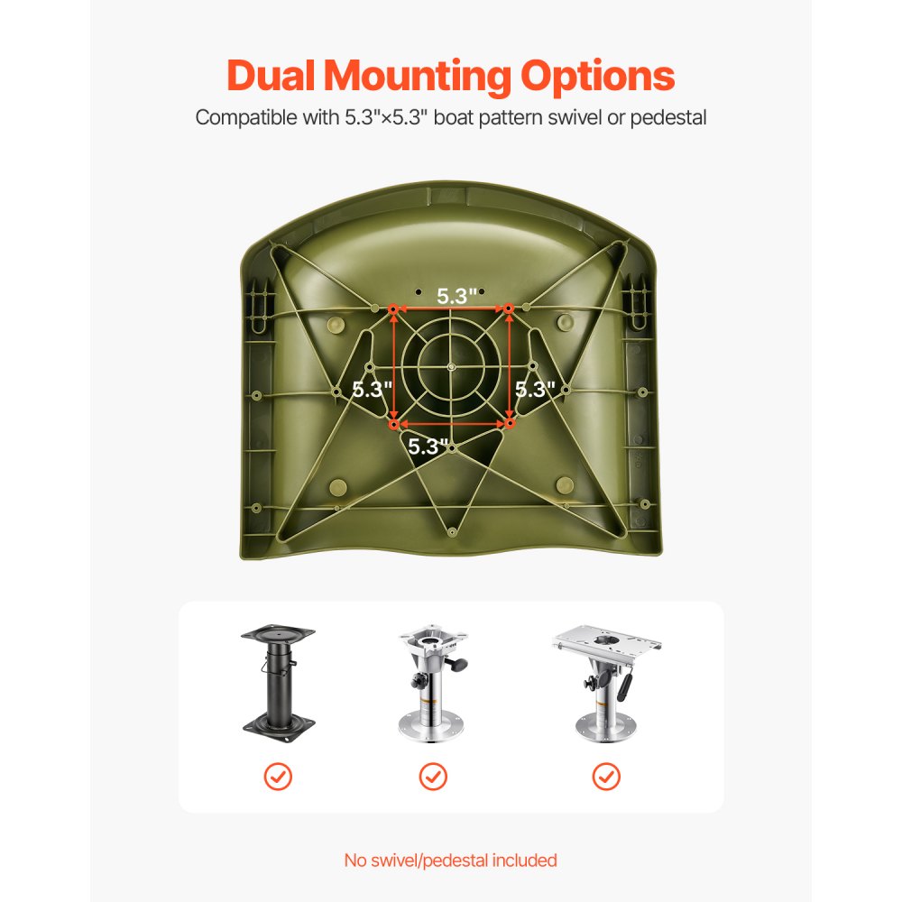 Montaż za pomocą otworów na śruby o wymiarach 13,46 x 13,46 cm: Składane siedzenie łodziowe ma otwory na śruby o rozstawie 5,3 cala (13,46 cm). Dostarczamy śruby i podkładki odporne na korozję, dzięki czemu siedzisko można łatwo i bezpiecznie przymocować do większości obrotowych uchwytów lub podstaw łodzi. Należy pamiętać, że podstawa łodzi i element obrotowy nie są zawarte w zestawie