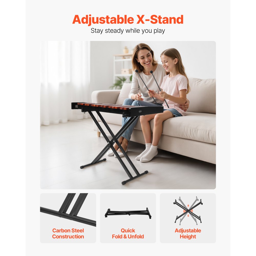 Składana podstawka X: Ten drewniany ksylofon jest wyposażony w składaną podstawkę X wykonaną ze stali węglowej, która zapewnia stabilność podczas gry. Regulowana wysokość w zakresie 32-95 cm jest odpowiednia dla osób w każdym wieku, a składana konstrukcja ułatwia przechowywanie i transport.