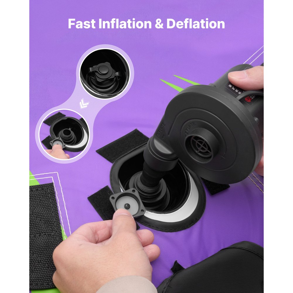 Szybkie pompowanie i spuszczanie powietrza: Dzięki bezpiecznemu zaworowi z hermetycznym uszczelnieniem i zabezpieczeniem przed wyciekiem, dmuchawę można łatwo napompować i spuścić powietrze. Nieużywana dmuchawa może być kompaktowo przechowywana i wygodnie transportowana. (Pompka nie jest dołączona)