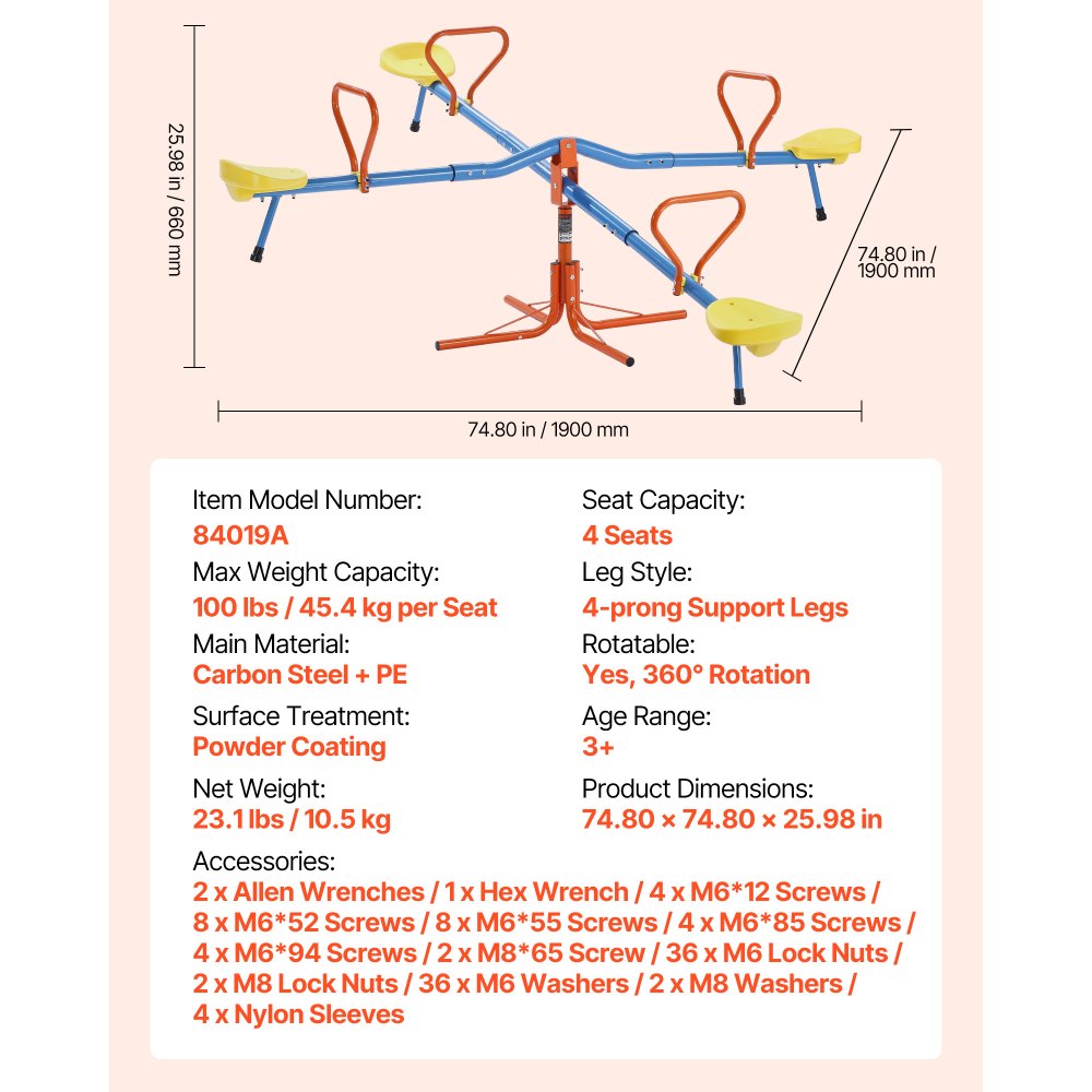 Huśtawka dziecięca, udźwig 45,4 kg na jedno siedzenie, huśtawka ogrodowa z nogami podporowymi z 4 zębami, huśtawka karuzelowa, obrót o 360 stopni, dla dzieci w wieku od 3 lat, huśtawka bujana z 4 siedzeniami, 190 x 190 x 66 cm