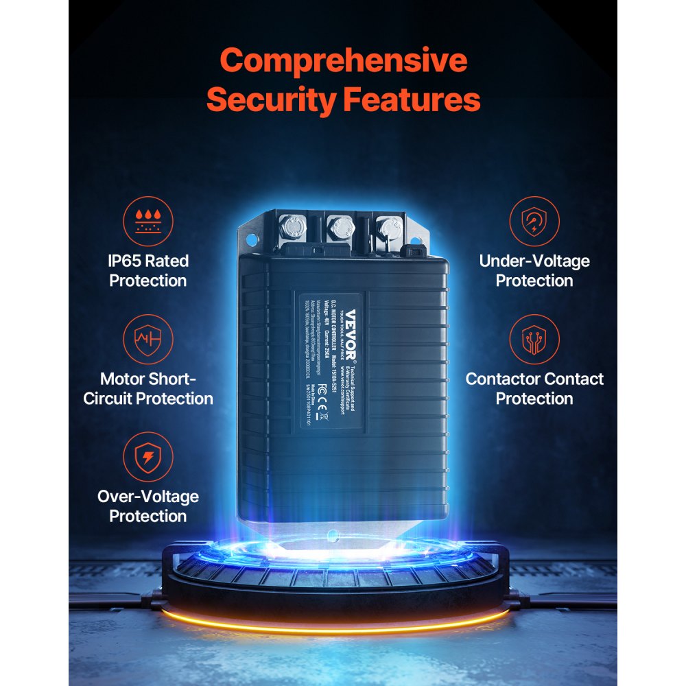 Kompleksowa ochrona: Ten sterownik wózka golfowego ma wbudowane funkcje ochrony przed zwarciem silnika, przepięciem, niedopięciem, stykiem stycznika i temperaturą. Klasa wodoodporności IP65 sprawia, że urządzenie nadaje się do pracy w trudnych warunkach pogodowych i wymagających środowiskach, gwarantując bezpieczną i niezawodną pracę.