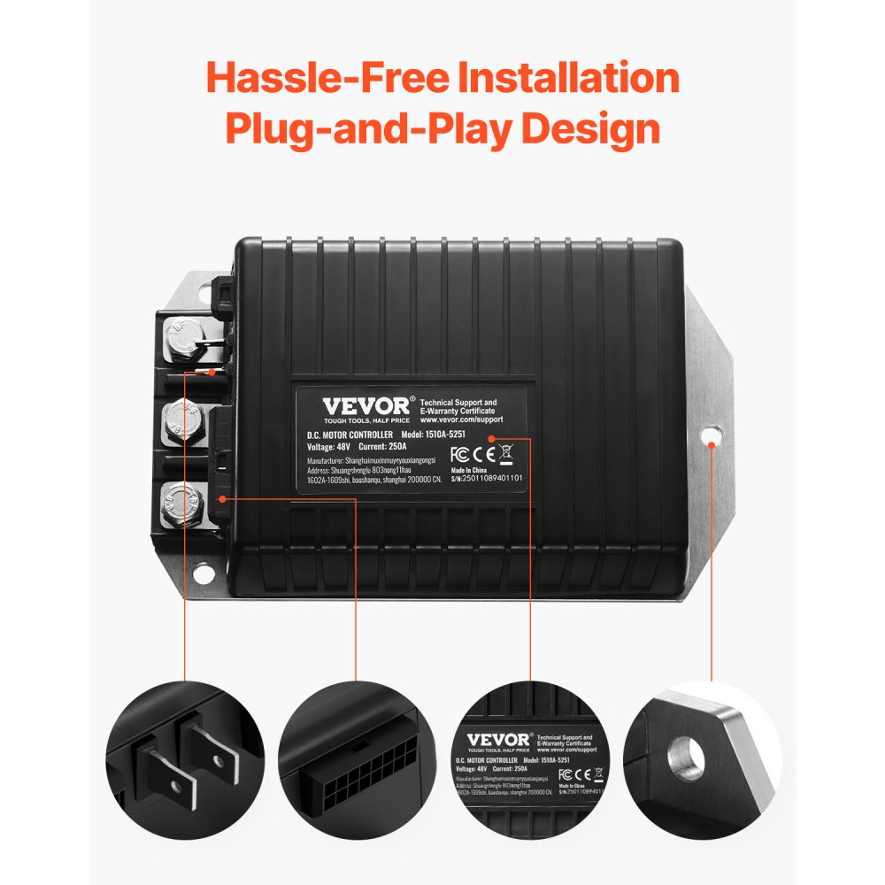 Kontroler prędkości wózka golfowego VEVOR, 48 V 250 A, zamiennik sterownika silnika prądu stałego do wózków golfowych Club Car z lat 2000-2008, stopień ochrony IP65, obudowa z aluminium ABS, kompatybilny z modelami 1510A-5251
