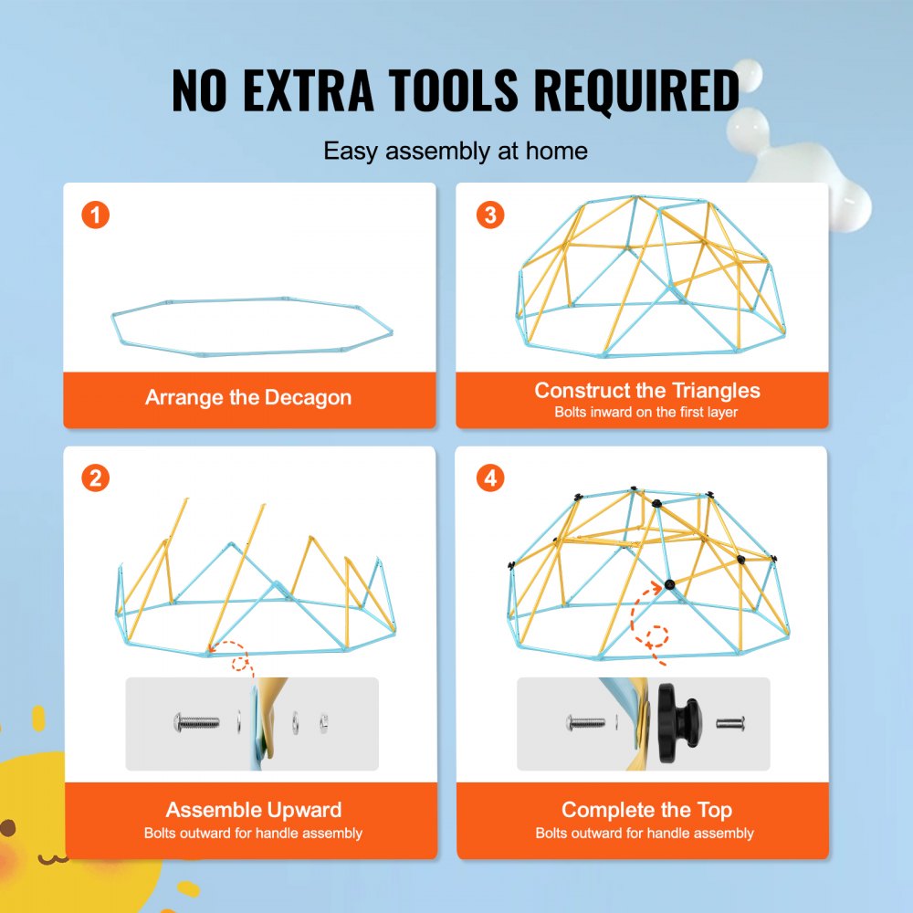 Łatwa konfiguracja: W zestawie znajdziesz wszystko, czego potrzebujesz – od narzędzi instalacyjnych po szczegółowe instrukcje i samouczki wideo. Nasze przejrzyste instrukcje bezproblemowo przeprowadzą Cię przez proces montażu, dzięki czemu szybko stworzysz zabawny plac zabaw dla swoich dzieci z naszą kopułą wspinaczkową dla dzieci.