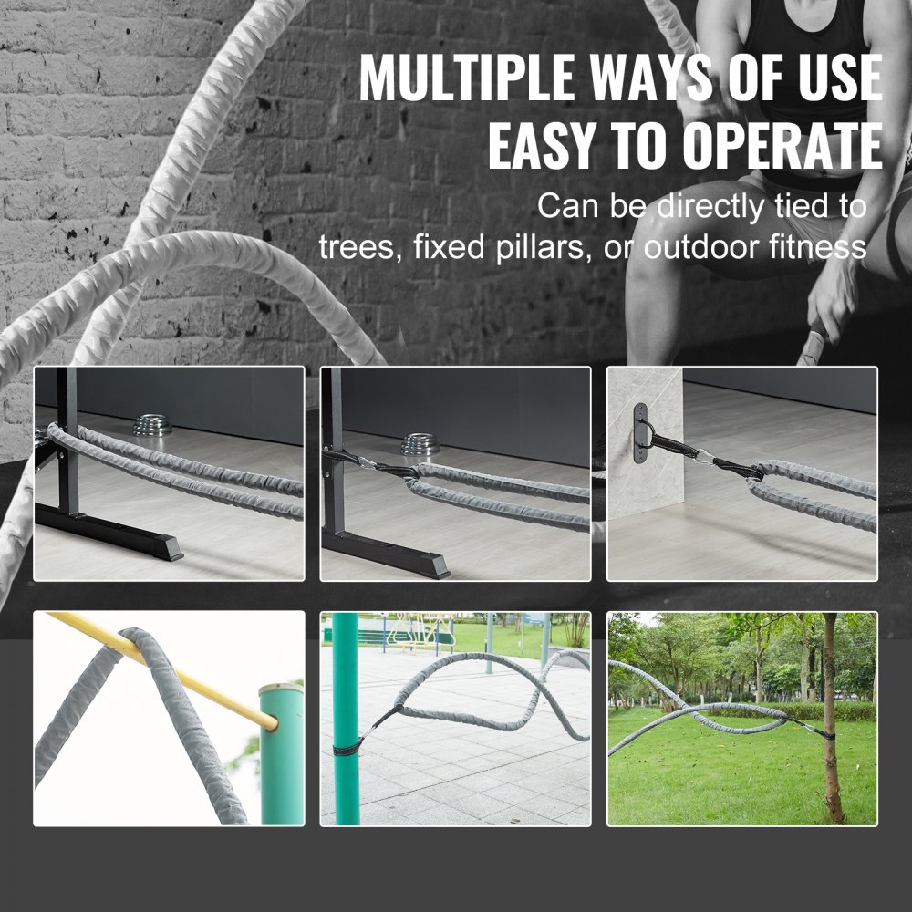 Lina treningowa VEVOR Battle Rope, średnica 1,5 cala, długość 30 stóp, poliestrowa lina treningowa, sprzęt do treningu bojowego z osłoną ochronną i kotwicą, wytrzymała lina do ćwiczeń w domowej siłowni, trening wzmacniający mięśnie korpusu, kolor szary - Sport i rekreacja | Galaxy Sklep