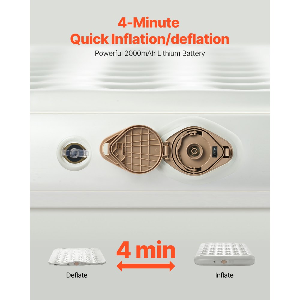 Szybkie pompowanie: wystarczy otworzyć torbę do przechowywania, rozłożyć materac, napompować go do połowy, włożyć do pokrowca i kontynuować pompowanie. Dzięki baterii o pojemności 2000 mAh pełne napompowanie zajmuje zaledwie 4 minuty. Konfiguracja jest szybka i łatwa.