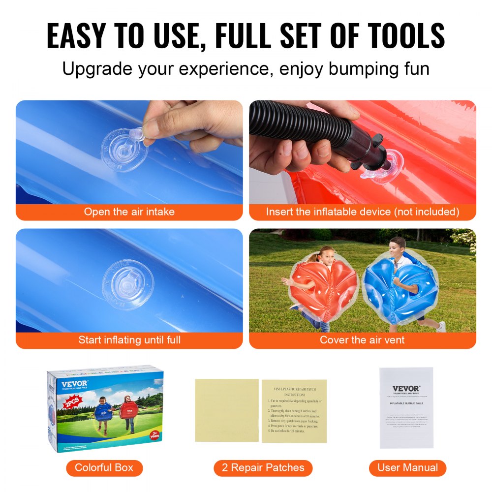 Wysokiej jakości materiał i niekończąca się zabawa: Z dmuchanymi piłkami bumper balls VEVOR (2 sztuki) dla dzieci, niekończąca się zabawa gwarantowana! Wykonane z odpornego na wybuchy PVC o grubości 0,3 mm, te piłki sumo są trwałe, bezpieczne, wodoodporne i zaprojektowane tak, aby zapobiegać ucieczce powietrza. Doskonała odporność na rozdarcie, zaawansowany system zaworów i szczelne zamknięcie gwarantują długotrwałą zabawę.