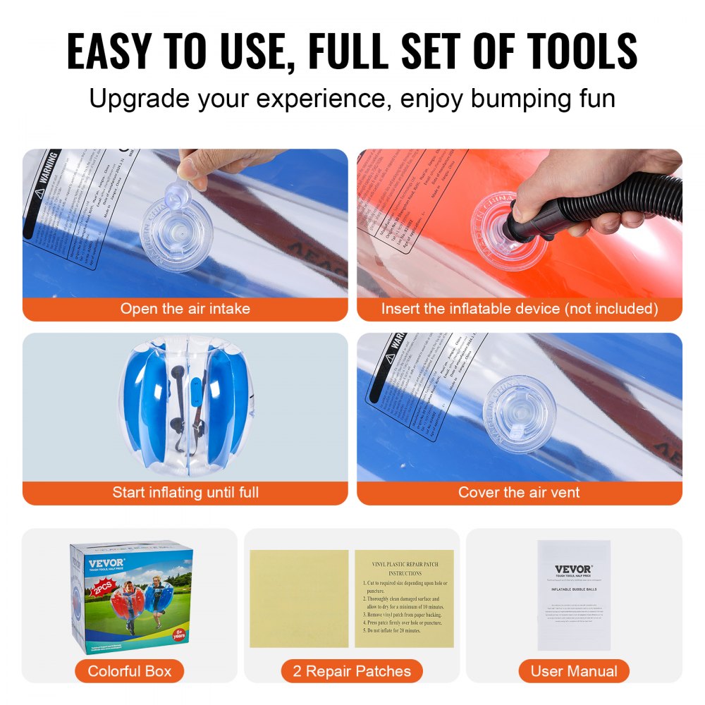 Wysokiej jakości materiał, niekończąca się zabawa: Zanurz się w niekończącej się zabawie z dmuchanymi piłkami typu bumper balls firmy VEVOR (2 sztuki). Wykonane z odpornego na wybuchy PVC o grubości 0,3 mm, te piłki sumo są trwałe, bezpieczne, wodoodporne i zaprojektowane tak, aby zapobiegać wyciekom powietrza. Doskonała odporność na rozdarcie, zaawansowany system zaworów i szczelne zamknięcie gwarantują długotrwałą zabawę.