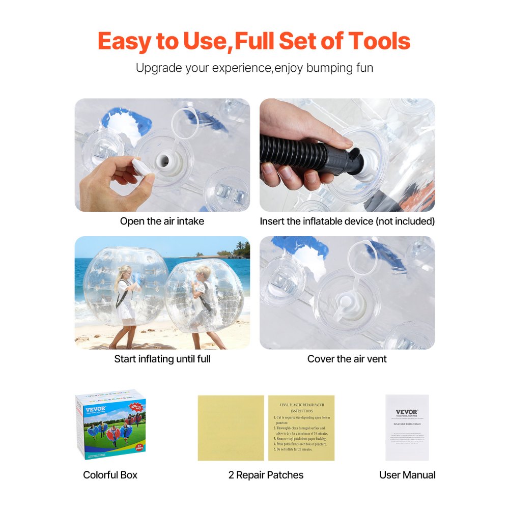 Wysokiej jakości materiał i niekończąca się zabawa: Zanurz się w niekończącej się zabawie z dmuchanymi piłkami bumper balls VEVOR w zestawie 2 sztuk! Wykonane z odpornego na wybuchy PVC o grubości 0,8 mm, te piłki sumo są trwałe, bezpieczne, wodoodporne i zaprojektowane tak, aby zapobiegać ucieczce powietrza. Doskonała odporność na rozdarcie, zaawansowany system zaworów i szczelne zamknięcie gwarantują długotrwałą zabawę.