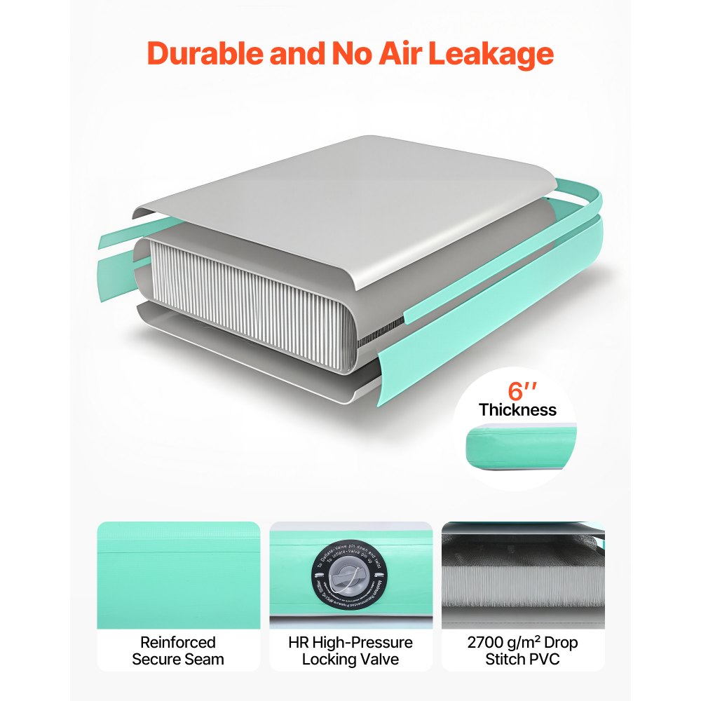 Stabilna szczelność: Wykonany z wytrzymałego PVC o gramaturze 2700 g/m² i grubości 15 cm (6 cali), zapewnia bezpieczne podparcie podczas stania, skakania i zabawy. Wzmocnione szwy zapewniają dodatkową stabilność. Wysokociśnieniowy zawór blokujący HR niezawodnie zatrzymuje powietrze nawet podczas długotrwałego użytkowania.
