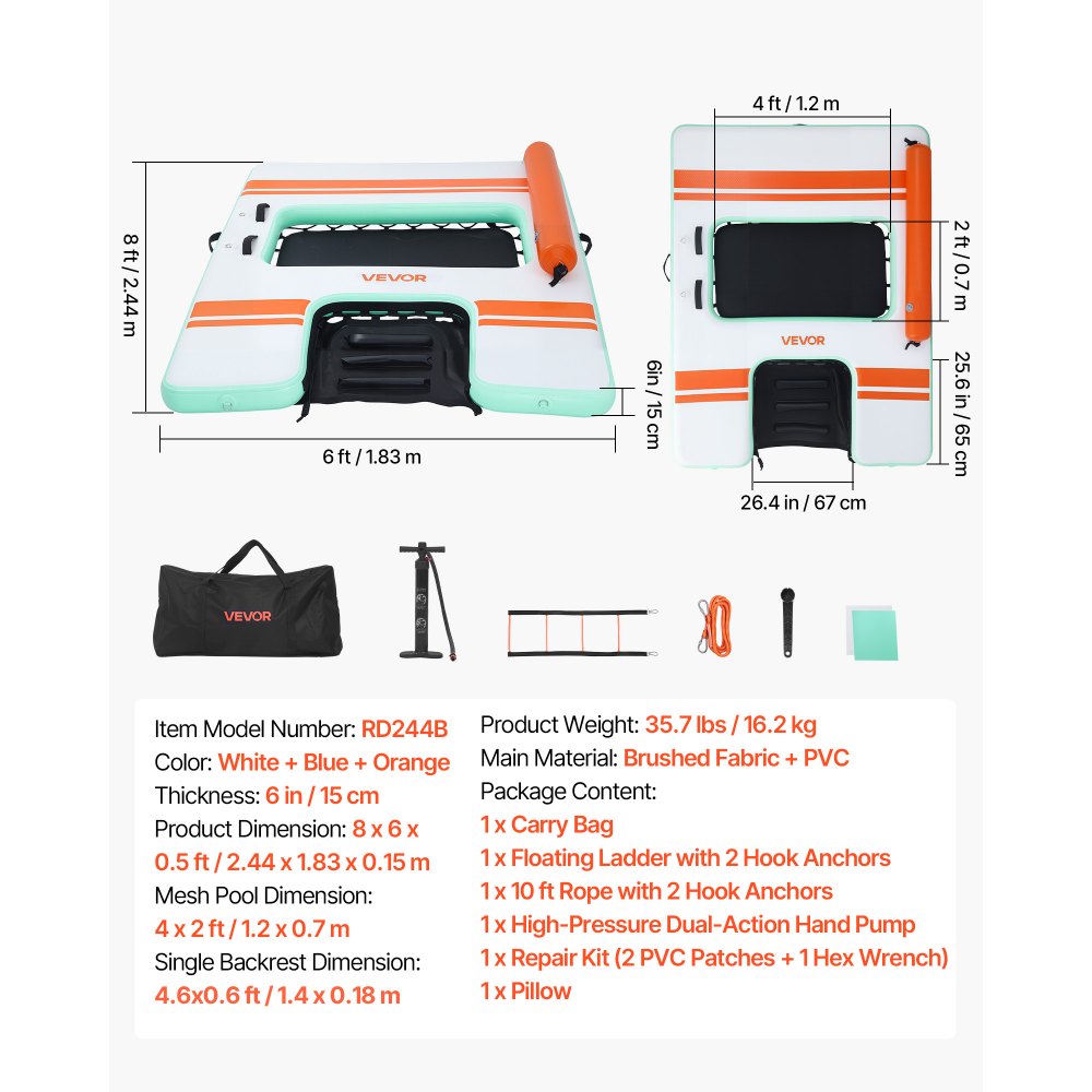 Nadmuchiwany pomost pływający VEVOR, 2,44 x 1,83 m, platforma pływająca z powierzchnią antypoślizgową, torba transportowa i odpinana drabinka, pływająca wyspa, platforma wodna do basenu, plaży i morza