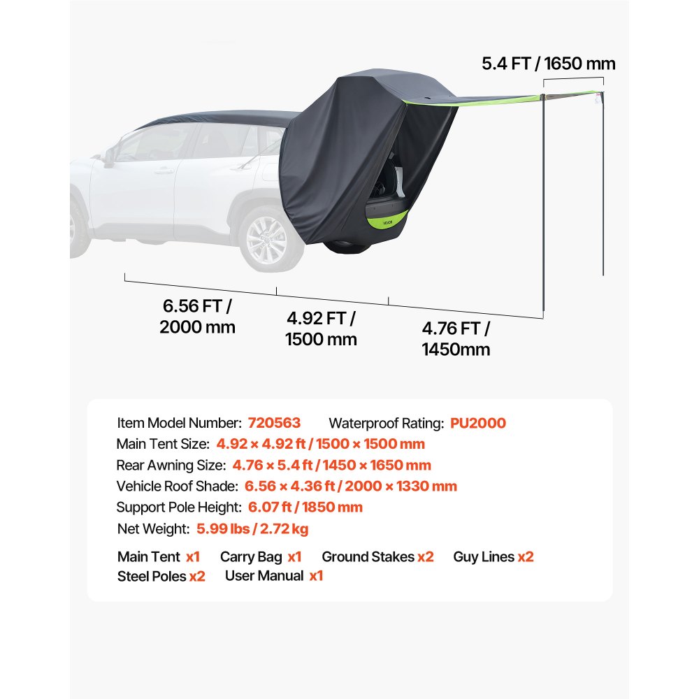 Przestronny i wygodny: wymiary głównego namiotu: 4,92 x 4,92 stopy (1,5 x 1,5 m), wymiary tylnej markizy: 4,76 x 5,4 stopy (1,45 x 1,65 m), osłona przeciwsłoneczna na dachu pojazdu: 6,56 x 4,36 stopy (2 x 1,33 m), zapewnia dużo miejsca do relaksu i zacienienia (nadaje się do SUV-ów z otwieraną do góry klapą tylną i małych vanów o obwodzie tyłu maks. 21,3 stopy / 6,5 m)