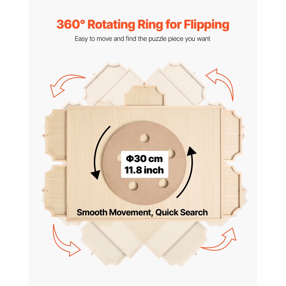 Obrotowy pierścień podstawy 360°: Ten przenośny stół do układania puzzli umożliwia płynny obrót o 360°. W ciągu zaledwie kilku sekund możesz bez wysiłku obrócić stół do żądanej pozycji. Zapewnia wygodny i przyjemny sposób grania w puzzle.
