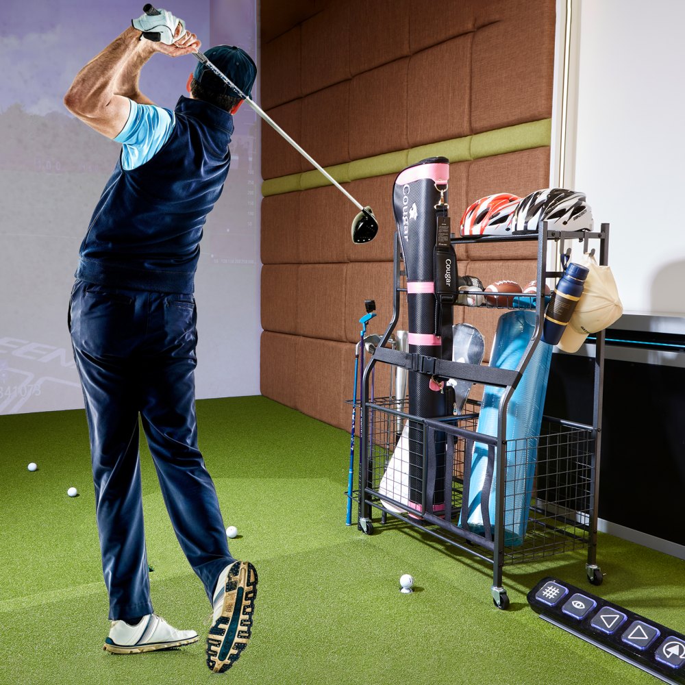 Bardzo duża pojemność: Ten wielofunkcyjny stojak do przechowywania sprzętu sportowego zawiera metalową ramę na rakiety, pojemnik z gumką, długi metalowy kosz, podwójny drążek górny oraz boczny stojak, który pomieści do 12 rakiet. Wszystkie te akcesoria do przechowywania pomagają uporządkować sprzęt sportowy, zapewniają schludne ułożenie przedmiotów, oszczędzają miejsce i zapewniają wygodny dostęp.
