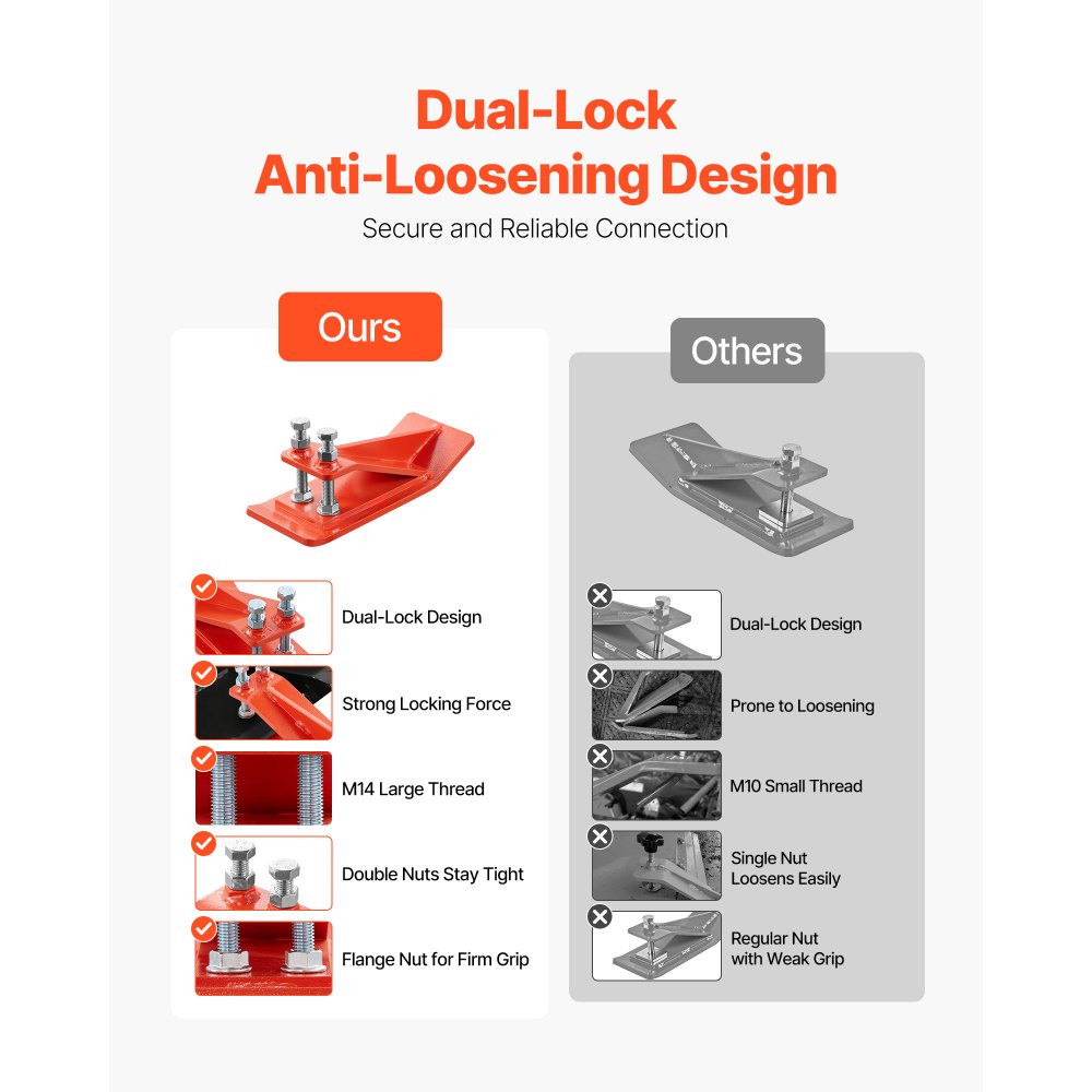 Podwójna blokada: W przeciwieństwie do ochraniaczy z pojedynczą blokadą, nasz ochraniacz krawędzi wiadra posiada podwójny mechanizm blokujący, zapewniający mocniejsze mocowanie. Śruby posiadają nakrętki zarówno u góry, jak i u dołu, a także większe gwinty M14, co zapewnia stabilne połączenie i niezawodność użytkowania.