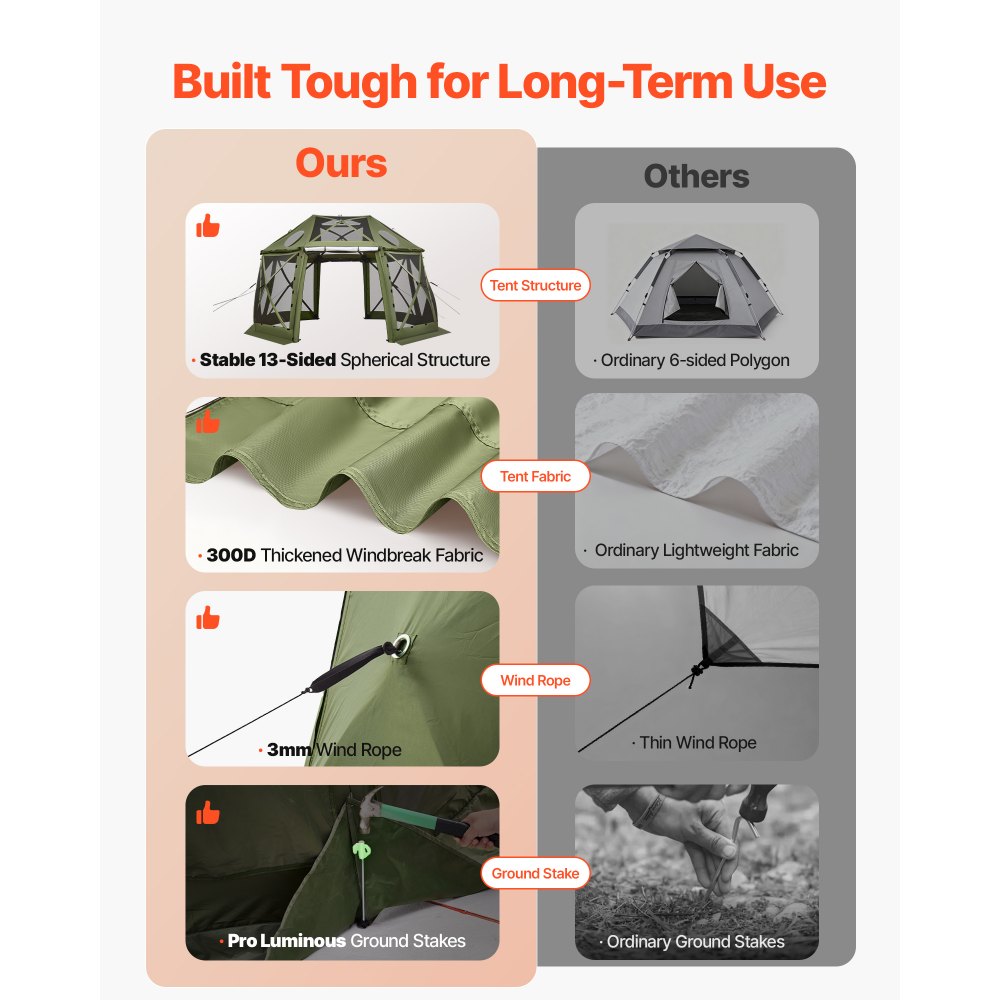 Trzynastostronna, wiatroodporna konstrukcja: Nasza altana ze wzmocnioną geodezyjną ramą jest odporna na zawalenie się podczas silnego wiatru. Grube, zwijane panele 300D zapewniają ochronę przed wiatrem i prywatność. W zestawie znajdują się liczne śledzie i linki odciągowe do bezpiecznego zakotwiczenia w podłożu. (Wskazówka: Dla bezpieczeństwa prosimy o złożenie i przechowywanie namiotu podczas burzy lub ulewnego deszczu).