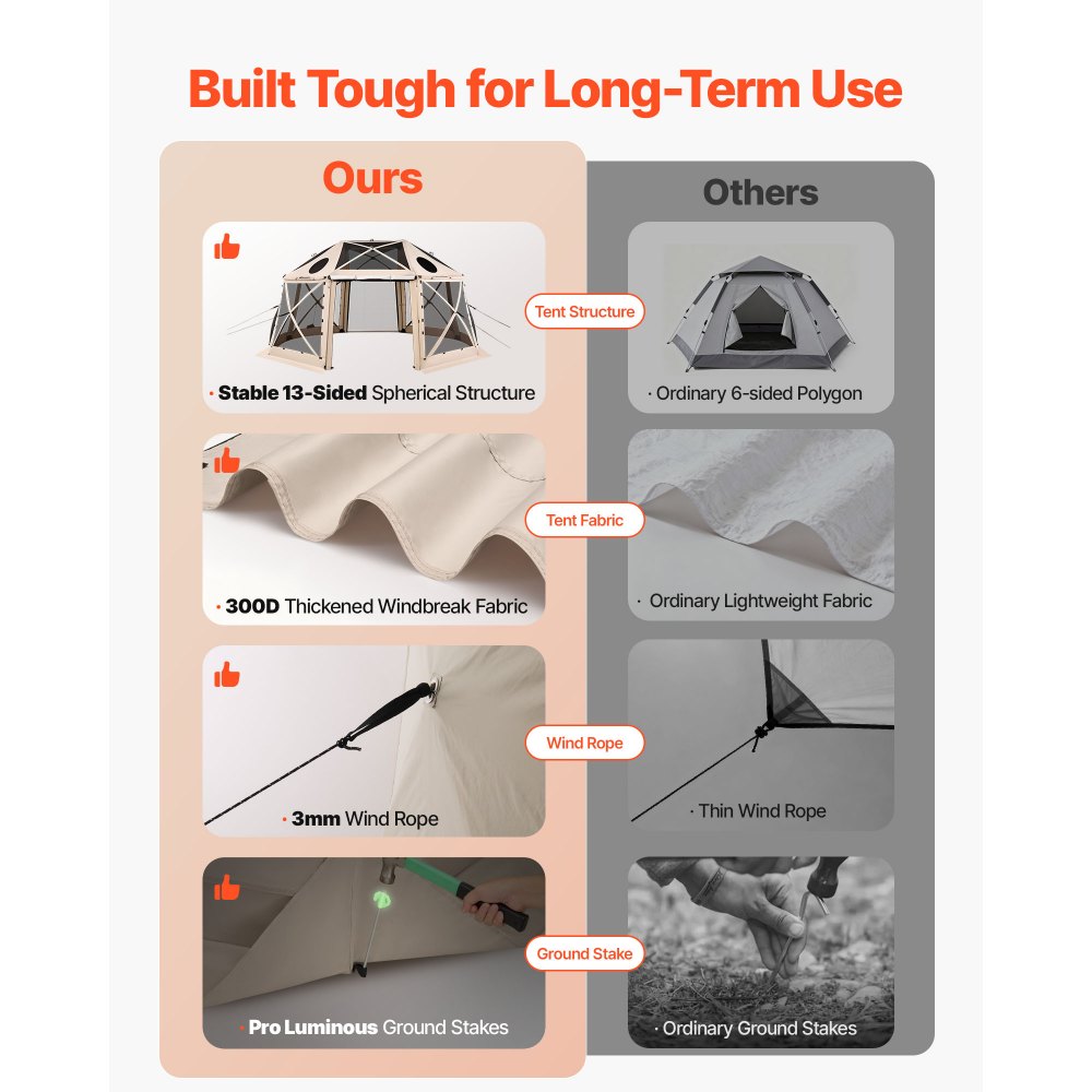 Trzynastostronna, wiatroodporna konstrukcja: Nasza altana ze wzmocnioną geodezyjną ramą jest odporna na zawalenie się podczas silnego wiatru. Grube, zwijane panele 300D zapewniają ochronę przed wiatrem i prywatność. W zestawie znajdują się liczne śledzie i linki odciągowe do bezpiecznego zakotwiczenia w podłożu. (Wskazówka: Dla bezpieczeństwa prosimy o złożenie i przechowywanie namiotu podczas burzy lub ulewnego deszczu).