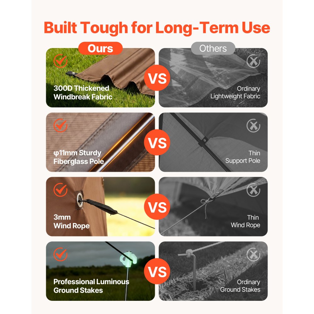 Konstrukcja odporna na wiatr: Wytrzymałe słupki z włókna szklanego i osiem wzmocnionych, zwijanych paneli przeciwwiatrowych zapewniają stabilność i prywatność. Boczne zapięcia na pętle zapobiegają łopotaniu paneli na wietrze. Składana altana jest wyposażona w kilka śledzi i linek odciągowych, co zapewnia bezpieczne rozstawienie na zewnątrz. (Wskazówka: Ze względów bezpieczeństwa należy złożyć altanę podczas ulewnego deszczu lub burzy).