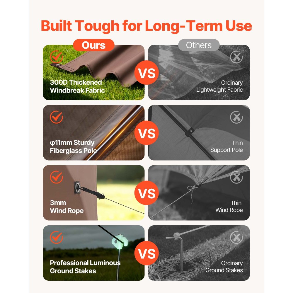 Konstrukcja odporna na wiatr: Wytrzymałe słupki z włókna szklanego i sześć wzmocnionych, zwijanych paneli przeciwwiatrowych zapewniają stabilność i prywatność. Boczne zapięcia na pętle zapobiegają łopotaniu paneli na wietrze. Składana altana jest wyposażona w kilka śledzi i linek odciągowych, co zapewnia bezpieczne rozstawienie na zewnątrz. (Wskazówka: Ze względów bezpieczeństwa należy złożyć altanę podczas ulewnego deszczu lub burzy).