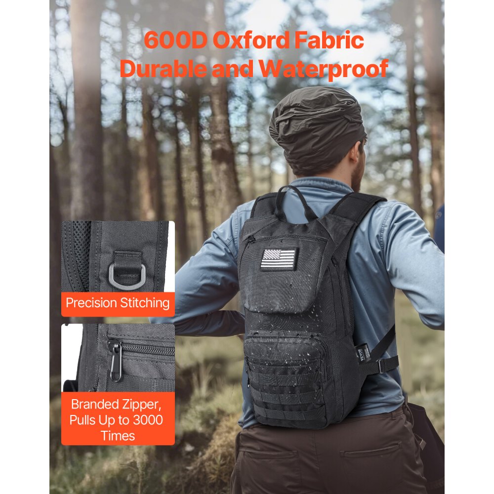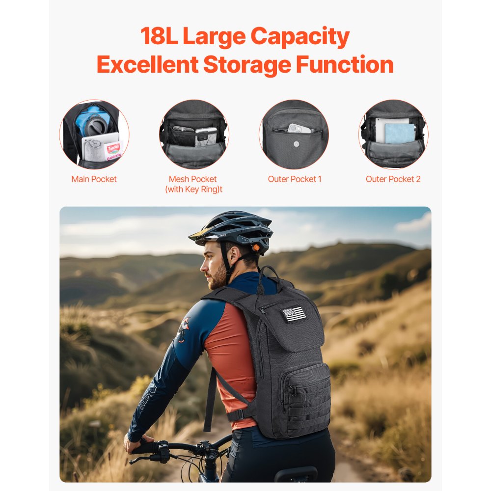 Idealny towarzysz przechowywania: Oprócz głównej kieszeni na 3-litrowy bukłak z wodą, duża kieszeń główna pomieści także ubrania, tablety i inne rzeczy. Trzy wewnętrzne kieszenie pomieszczą portfele, telefony, jedzenie i inne przedmioty, natomiast zewnętrzna warstwa wyposażona jest w pięć pasków Molle do mocowania latarek, butelek z wodą i innego sprzętu. Elastyczne i konfigurowalne miejsce do przechowywania pozwala mieć wszystkie przedmioty pod ręką.