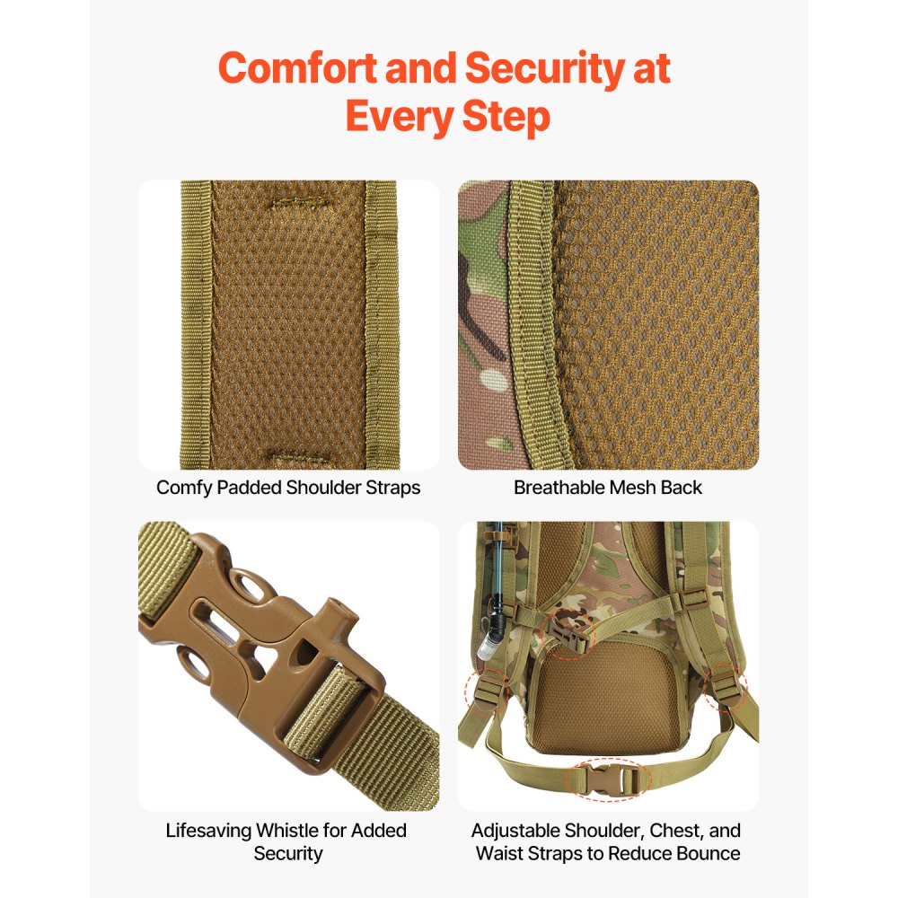 Idealny towarzysz przechowywania: Oprócz głównej kieszeni na 3-litrowy bukłak z wodą, duża kieszeń główna pomieści także ubrania, tablety i inne rzeczy. Trzy wewnętrzne kieszenie pomieszczą portfele, telefony, jedzenie i inne przedmioty, natomiast zewnętrzna warstwa wyposażona jest w pięć pasków Molle do mocowania latarek, butelek z wodą i innego sprzętu. Elastyczne i konfigurowalne przechowywanie pozwala mieć wszystkie przedmioty w zasięgu ręki