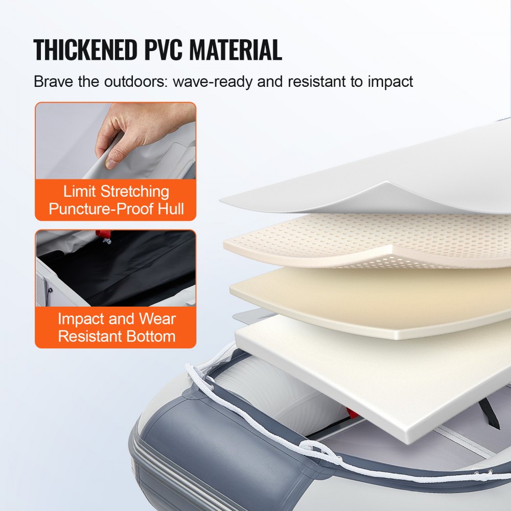 Solidna konstrukcja: Ten ponton wykonany jest z grubego tworzywa PVC, co zapewnia doskonałą wytrzymałość na rozciąganie i przebicie, dzięki czemu jest przystosowany do żeglugi morskiej i odporny na fale, uderzenia piasku i erozję morską. Ulepszona konstrukcja zawiera cztery niezależne komory powietrzne dla dodatkowego bezpieczeństwa, gwarantując, że uszkodzenie jednej z nich nie wpłynie na wyporność łodzi.