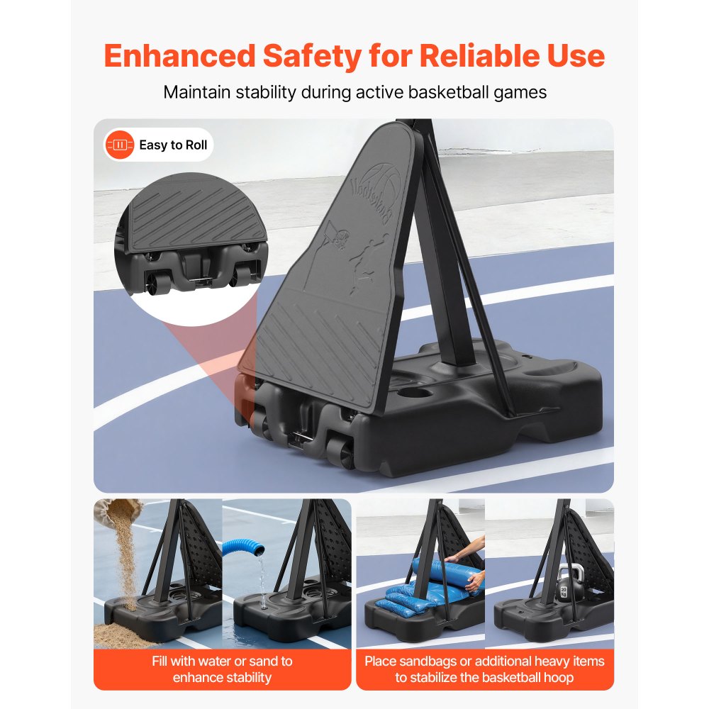 Do trudnych rozgrywek: Ten stojak do koszykówki, wykonany ze wzmocnionej stali z podkładem z poliwęglanu, pozostaje stabilny nawet po uderzeniach. Solidną podstawę można wypełnić wodą lub piaskiem dla lepszej równowagi. Dzięki temu dynamiczne rozgrywki koszykówki pozostają stabilne i zapewniają dobrą zabawę dla wszystkich członków rodziny.
