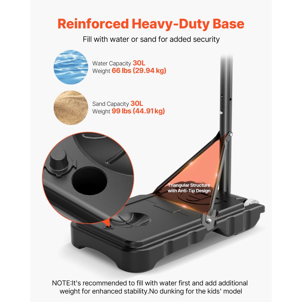 Solidna rama: Ten regulowany kosz do koszykówki posiada wytrzymałą, kwadratową stalową ramę z tablicą z polietylenu, co zapewnia wyjątkową stabilność i odporność na uderzenia. Grubą podstawę można wypełnić wodą lub piaskiem, co gwarantuje stabilność nawet podczas intensywnej gry i rodzinnej zabawy.
