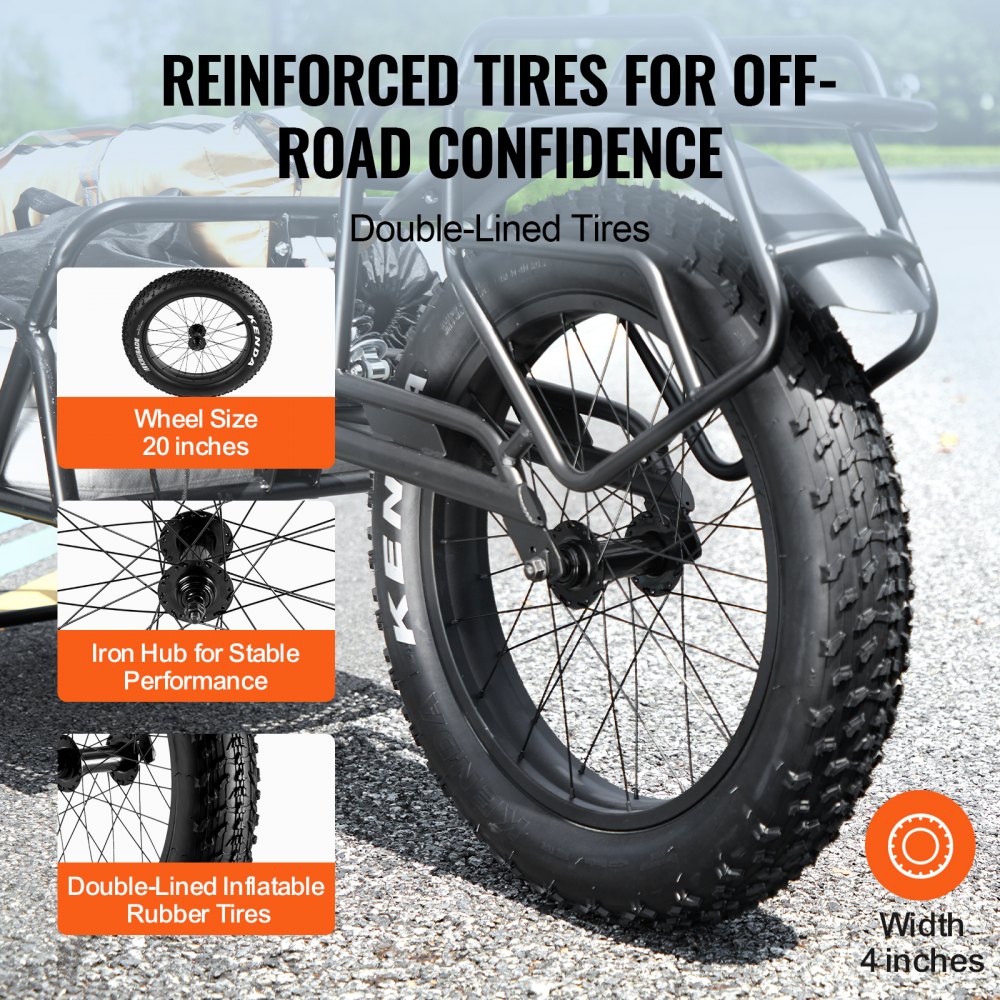 Profesjonalna konstrukcja opon: Wyposażona w sportowe opony 20 cali/508 mm i żeliwne piasty, nasza przyczepka rowerowa zapewnia doskonałą stabilność i przyczepność na różnych nawierzchniach, niezależnie od tego, czy jeździsz po betonie, żwirze, czy piaszczystych ścieżkach. Konstrukcja z jednym kołem sprawdza się na wąskich drogach, a system zawieszenia zapewnia stabilność podczas pokonywania wzniesień.