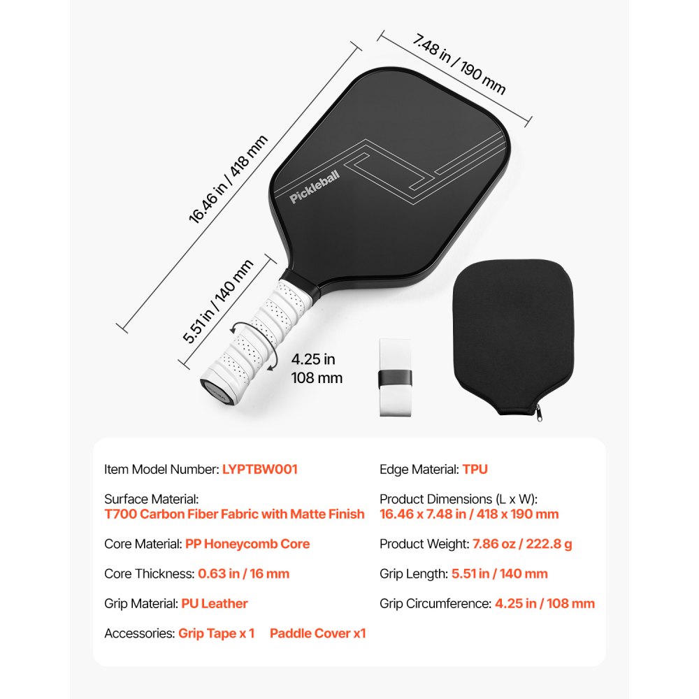 Rakietka do pickleballa VEVOR z powierzchnią z włókna węglowego T700 i rdzeniem o strukturze plastra miodu, profesjonalna rakietka do pickleballa o zwiększonej mocy, kontroli i rotacji dla dorosłych mężczyzn i kobiet, czarna