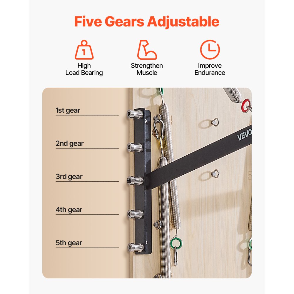 Regulowany poziom oporu: montowany na ścianie reformer do ćwiczeń Pilatesa wykorzystuje wysokiej jakości sprężyny, które zapewniają solidną i stabilną konstrukcję. Posiada 8 regulowanych poziomów, zawiera mieszankę mocnych, średnich i lekkich sprężyn i posiada 5 regulowanych zaczepów na stopy oraz 10 regulowanych kołków na desce, które umożliwiają dostosowane treningi