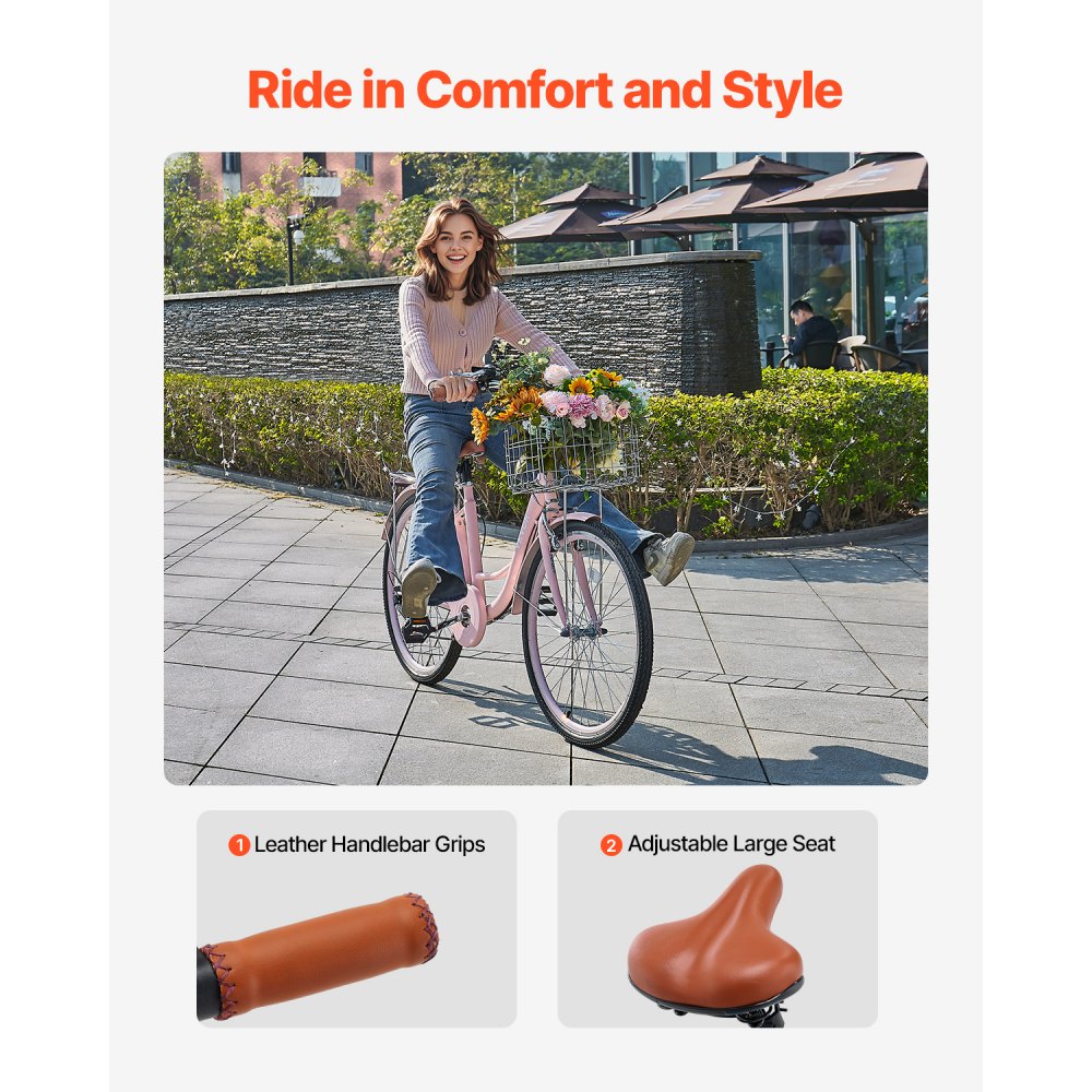 Rower typu cruiser VEVOR z 7 biegami (średnica opony 660,4 mm) Rower plażowy z dużym koszykiem i bagażnikiem, rower typu cruiser z regulowanym siodełkiem, do jazdy na rowerze, treningu i zakupów, różowy - Sport i rekreacja | Galaxy Sklep