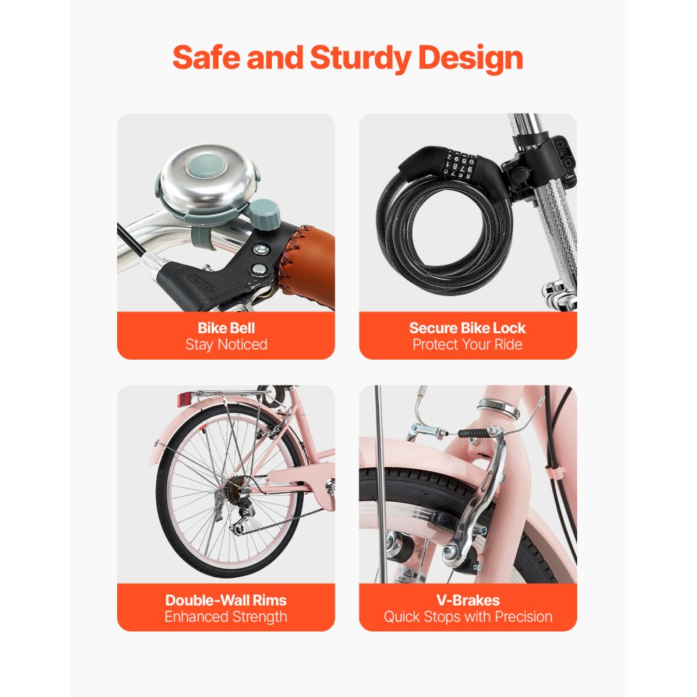 Trwały i niezawodny: Ten rower typu cruiser ma ramę ze stali węglowej i jest odporny na codzienne zużycie. Hamulce typu V z przodu i z tyłu zapewniają dużą siłę hamowania, a dwuwarstwowe obręcze zwiększają trwałość. Wyposażony w odblaski, błotniki, dzwonek i zamek szyfrowy dla dodatkowego bezpieczeństwa i komfortu