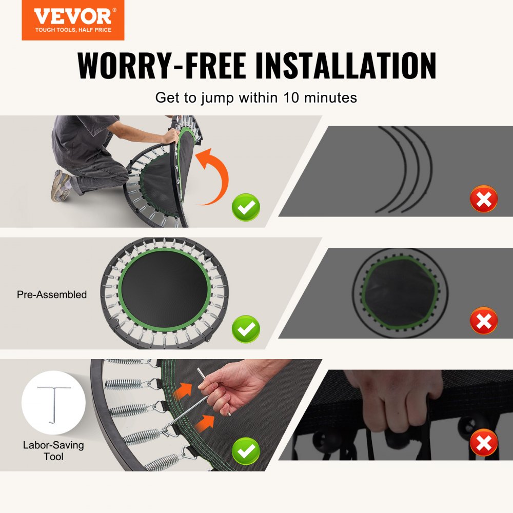 Łatwy montaż: Zacznij skakać w mgnieniu oka! Trampolina fitness jest dostarczana częściowo zmontowana, a dzięki dołączonym narzędziom oszczędzającym pracę możesz ją w pełni rozłożyć i przygotować do użycia w zaledwie 10 minut.