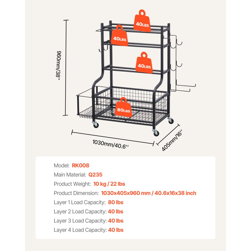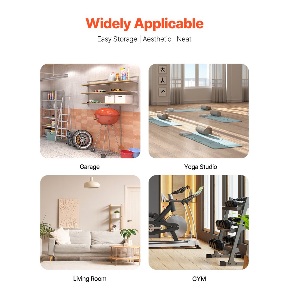 Solidny i trwały materiał: Ten regał magazynowy wykonany jest z wysokiej jakości malowanej proszkowo stali (rama i pogrubione rury), co gwarantuje trwałość i odporność na zużycie przez wiele lat użytkowania. Stojak wytrzymuje ciężar do 200 funtów (80 + 40 + 40 + 40 funtów / 36,92 + 18,14 + 18,14 + 18,14 kg) i oferuje trwałe rozwiązania w zakresie przechowywania. Antypoślizgowe otwory na hantle zaprojektowano tak, aby zapobiegać ryzyku wypadnięcia ciężarków