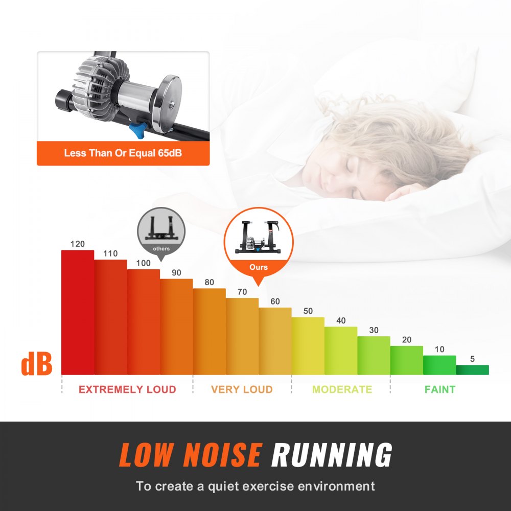 Cicha i płynna praca: W porównaniu z trenażerami magnetycznymi, ten trenażer z płynnym oporem jest cichszy (≤ 65 dB), zapewniając płynniejszą i bardziej komfortową jazdę dzięki naszemu stojakowi do trenażera stacjonarnego. Uwaga: Poziom hałasu może się różnić w zależności od materiału opony i wzoru bieżnika. Zalecane jest używanie rowerów szosowych, aby zapewnić najcichszą pracę.