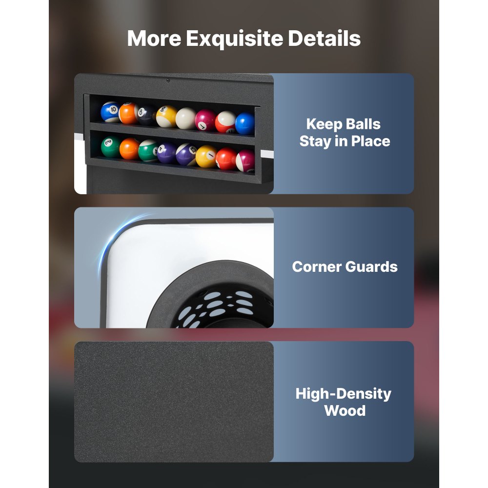 Wykwintne detale: Wzmocnione siatki pewnie trzymają bile, a narożniki chronią stół i ściany. Koniec z porysowanymi podłogami i krzywymi uderzeniami. Wysokiej jakości filcowa powierzchnia i taśma zabezpieczająca nadają stołowi bilardowemu elegancji i trwałości.