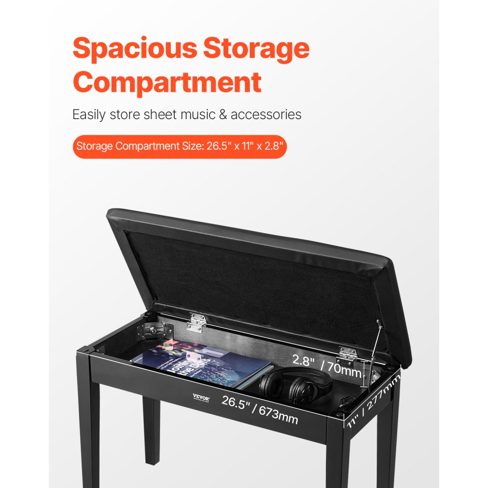 Przestronny schowek: Ta ławka do pianina ma schowek o wymiarach 673 x 277 x 70 mm (26,5 x 11 x 2,8 cala), który zapewnia mnóstwo miejsca na książki muzyczne, akcesoria i wiele innych rzeczy. Ciesz się dobrze zorganizowanym zestawem muzycznym i miej wszystkie niezbędne rzeczy w zasięgu ręki.