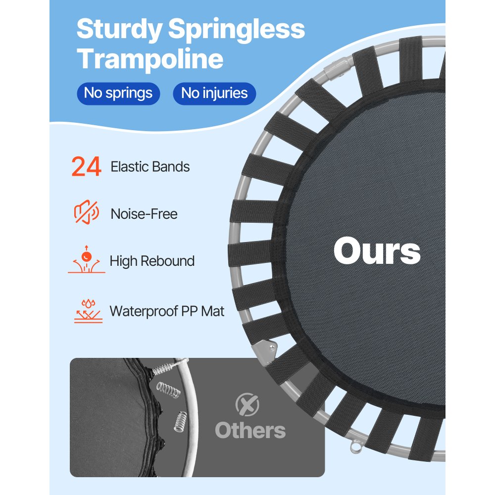 Wzmocnione nogi: Ta mini trampolina dla maluchów została zaprojektowana z myślą o trwałości dzięki solidnej ramie, macie do skakania z polipropylenu, podkładkom bezpieczeństwa, płaskim gumom, gumowym końcówkom rurek na nogi oraz uchwytom pokrytym pianką. Ulepszone, wzmocnione nogi są odporne na wyginanie i odkształcanie, zapewniając solidną stabilność. Gumowe podkładki na stopy gwarantują ciche skakanie.