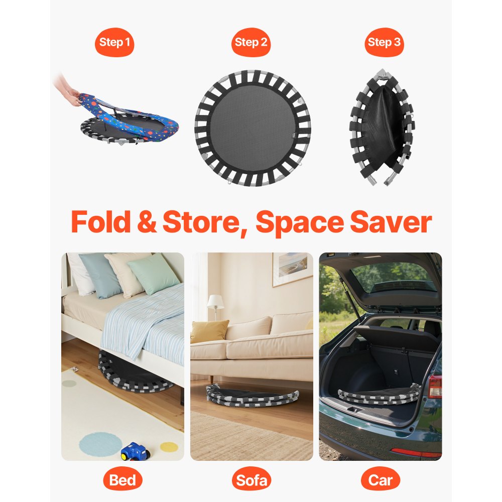 Szybkie przechowywanie dzięki składanej konstrukcji: Dzięki składanej konstrukcji ramy nasza trampolina dla maluchów do użytku wewnątrz i na zewnątrz zajmuje po złożeniu zaledwie jedną czwartą swojej pierwotnej objętości, co ułatwia przechowywanie i oszczędza miejsce. Można ją schować pod sofą lub w bagażniku samochodu. Składana konstrukcja ułatwia również transport, pozwalając dzieciom skakać, gdziekolwiek chcą.