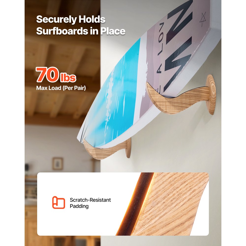 Stabilny udźwig: Każdy stojak na deski surfingowe wytrzymuje ciężar do 15,9 kg (35 funtów), a para uchwytów do 31,7 kg (70 funtów), co pozwala na bezpieczne przechowywanie desek. Punkty styku są wyposażone w odporne na zarysowania podkładki, które zapobiegają uszkodzeniom podczas przenoszenia desek.