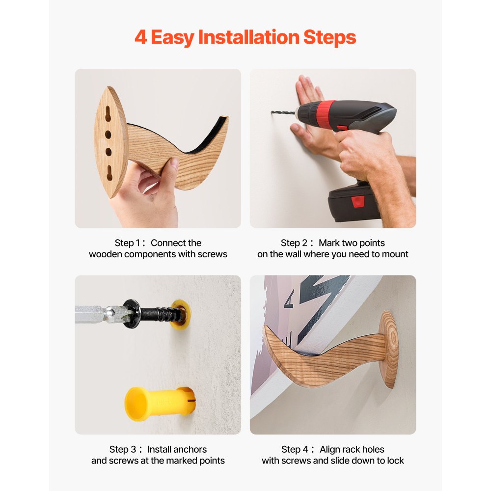 Wieszak ścienny na deskę surfingową VEVOR, poziomy, wykonany z drewna, do przechowywania i eksponowania, regulowany organizer do desek do kitesurfingu, krótkich desek, nart, snowboardów, wakeboardów