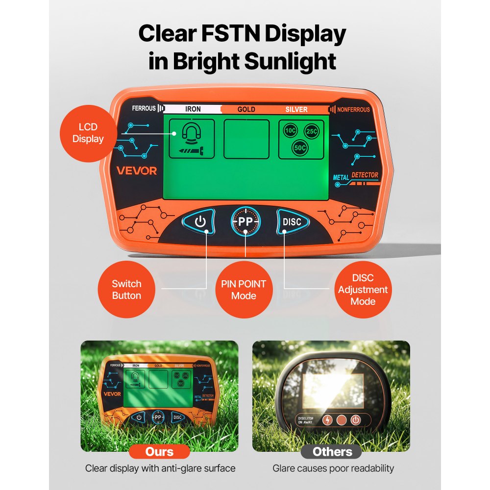 Wyświetlacz czytelny w świetle słonecznym: Ten wykrywacz metali dla dorosłych wyposażony jest w wyświetlacz FSTN, który pozostaje czytelny nawet na plaży, w bezpośrednim świetle słonecznym lub jasnym. Dzięki temu podejmowanie trafniejszych decyzji i redukcja fałszywych odczytów są łatwiejsze.