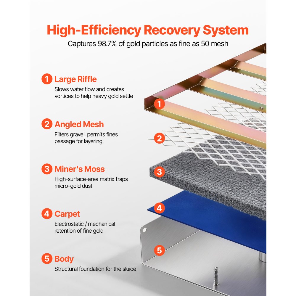 Śluza do złota 2 w 1 z funkcją wysokiego nasypu: Łatwe przełączanie między trybami śluzy i wysokiego nasypu. Tryb wysokiego nasypu jest idealny do przetwarzania większych ilości materiału, natomiast tryb śluzy jest idealny do płytkich wód i małych strumieni. Pozwala to sprostać szerokiemu zakresowi potrzeb związanych z poszukiwaniem złota.