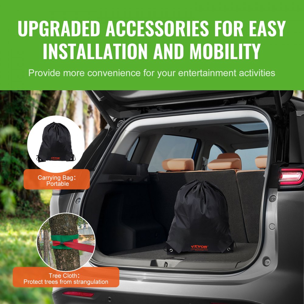 Ulepszone akcesoria: Ta tyrolka dla dzieci i dorosłych zawiera wszystko, czego potrzebujesz. W zestawie znajduje się torba transportowa, która ułatwia przechowywanie i transport. W zestawie znajdują się dwa ochraniacze na drzewa, które zapobiegają ich uszkodzeniu, a także chronią luźne liny, wydłużając ich żywotność. Napinacz pozwala na bezproblemowe napinanie i zabezpieczanie pasów jednym ruchem nadgarstka.