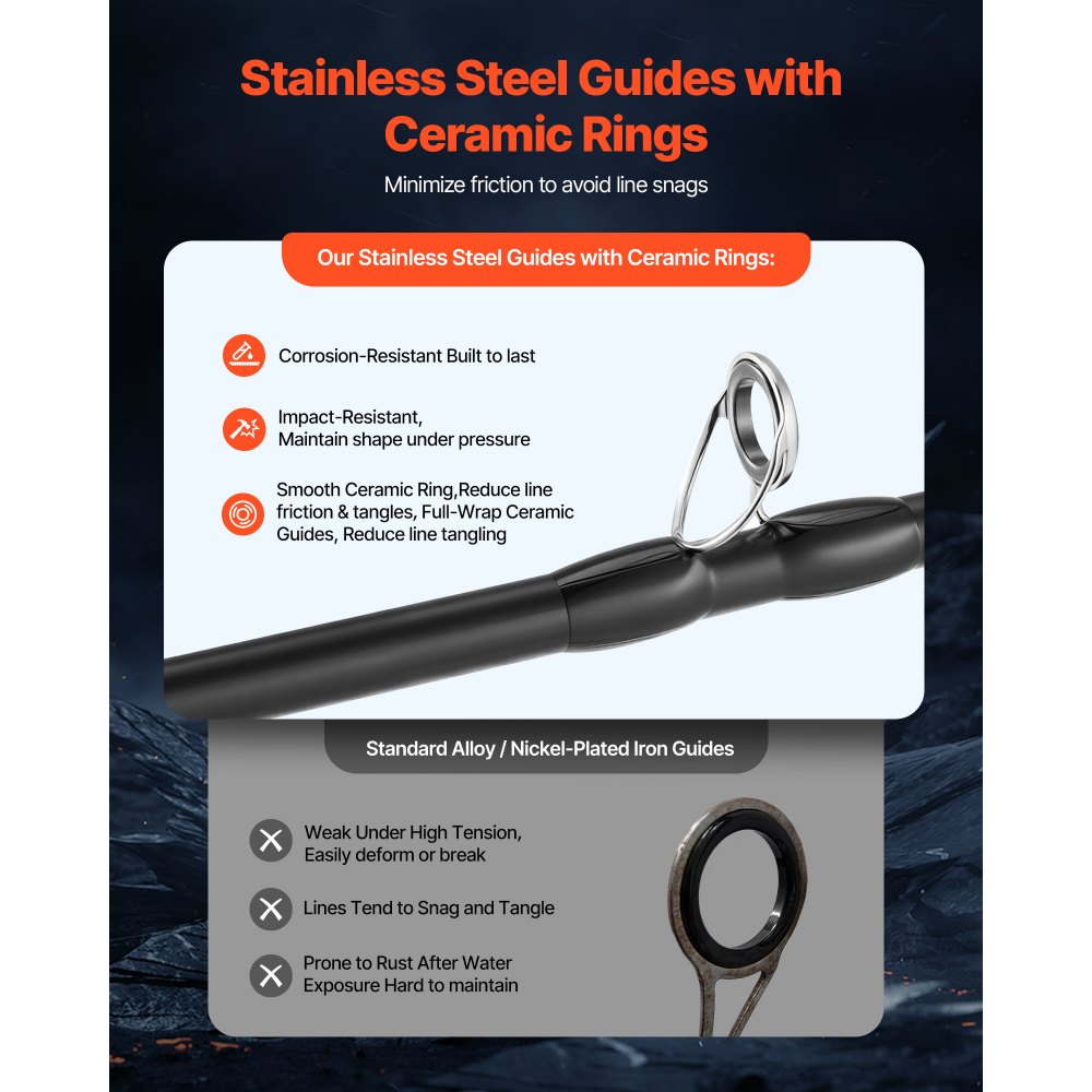 Wysokiej jakości pierścienie prowadzące: Wykonane z wytrzymałej stali nierdzewnej, te pierścienie prowadzące zapewniają doskonałą odporność na korozję i zachowują swój kształt nawet przy silnych uderzeniach. Gładkie ceramiczne pierścienie minimalizują splątanie żyłki, zapewniając płynniejsze i bardziej wydajne wędkowanie.