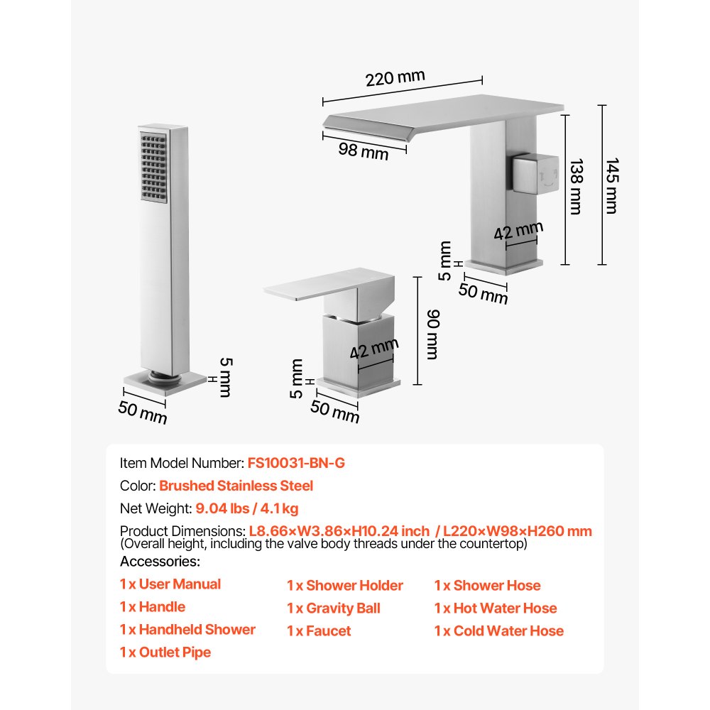 Montaż na 3 otwory: Ta rzymska bateria wannowa ma konstrukcję z 3 otworami do montażu na blacie, kompatybilną z większością wanien. Pasuje do otworów montażowych o średnicy od 1,3 do 1,49 cala (33-37,84 mm) i grubości blatu od 0,4 do 1,4 cala (10,16-35,56 mm), zapewniając elastyczną instalację w każdej łazience.