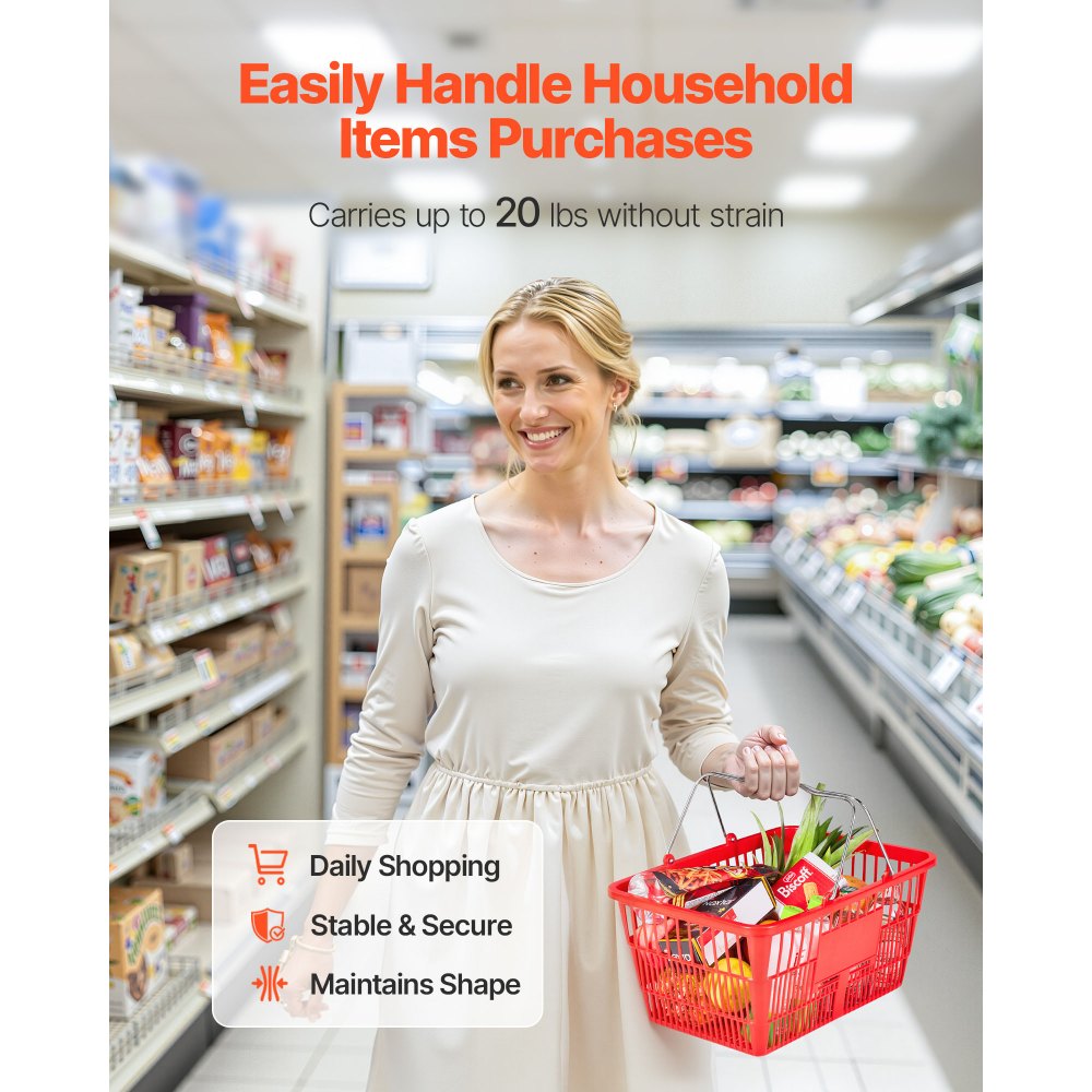 Koszyk zakupowy VEVOR, 12 szt., 21 l, składany, kosz transportowy, kosz z tworzywa sztucznego PE z metalowymi uchwytami, kosz sprzedażowy o ładowności 9,07 kg, do sklepów spożywczych, handlu detalicznego, supermarketów - Sprzęt czyszczący | Galaxy Sklep