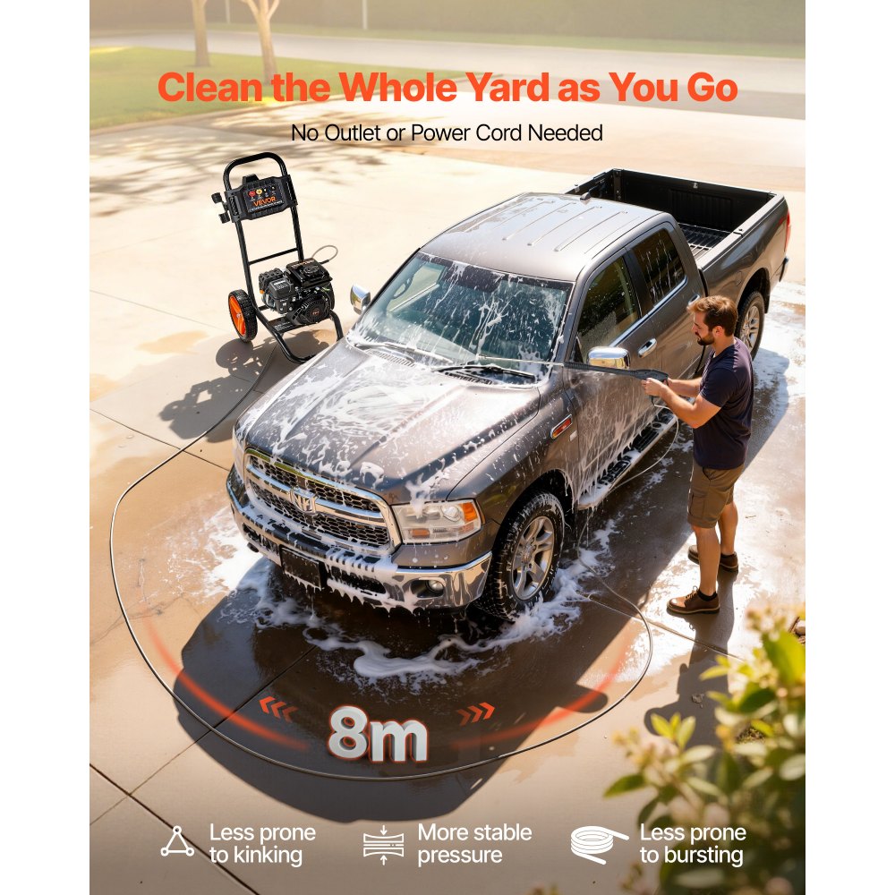 Duży obszar czyszczenia: Wąż wysokociśnieniowy o długości 7,9 m zapewnia maksymalną swobodę ruchu po podłączeniu do źródła wody. 10-calowe koła benzynowej myjki tarasowej pomogą Ci wyczyścić cały ogród lub vany z czterema lub sześcioma miejscami siedzącymi i duże SUV-y.